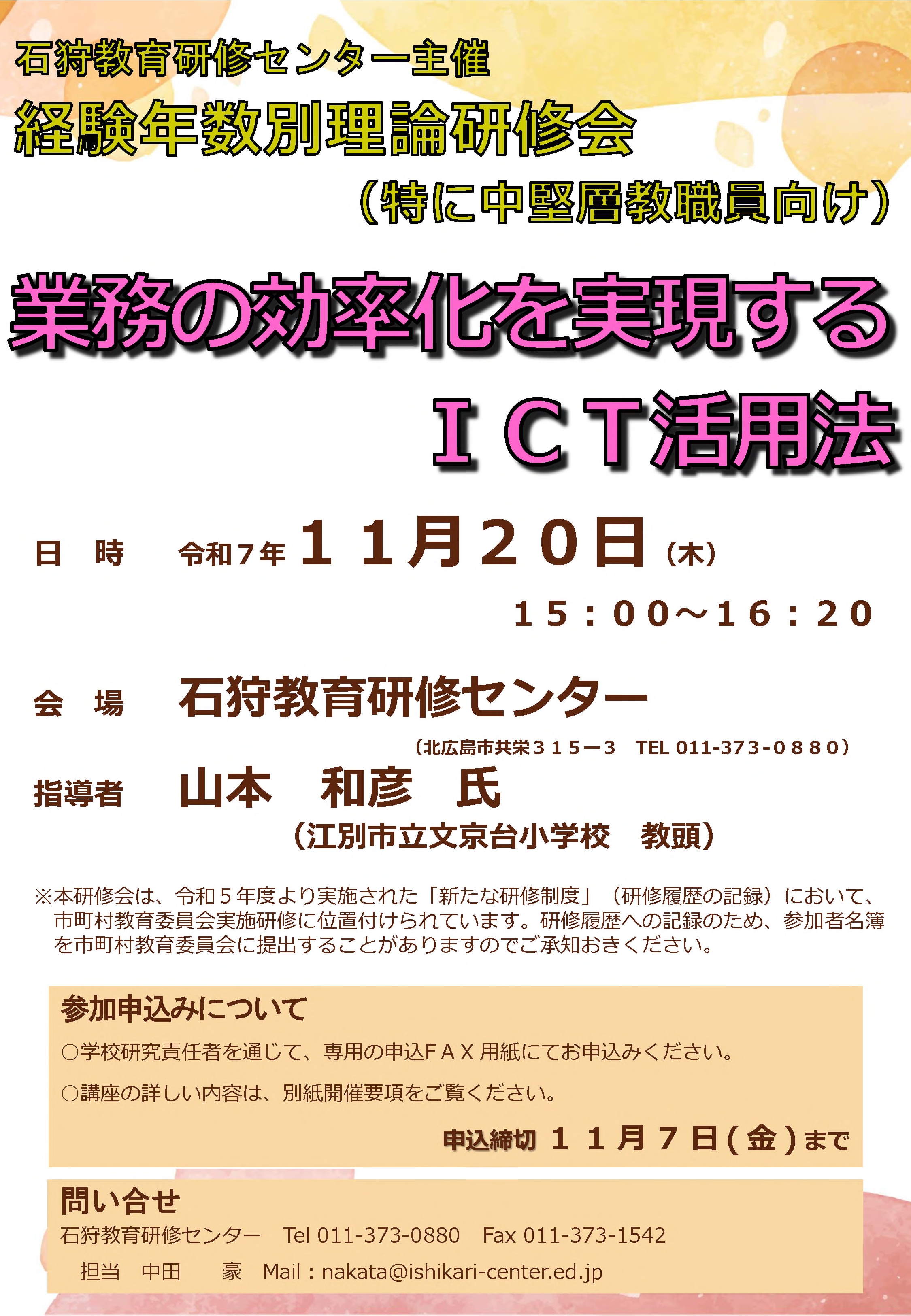 石狩教育研修センターの主催で、今日的な課題に関わる内容についての研修会を開催します。 第3回は、特に30代から40代の教職員を対象とした研修会を実施します。 たくさんの方のご参加をお待ちしております。