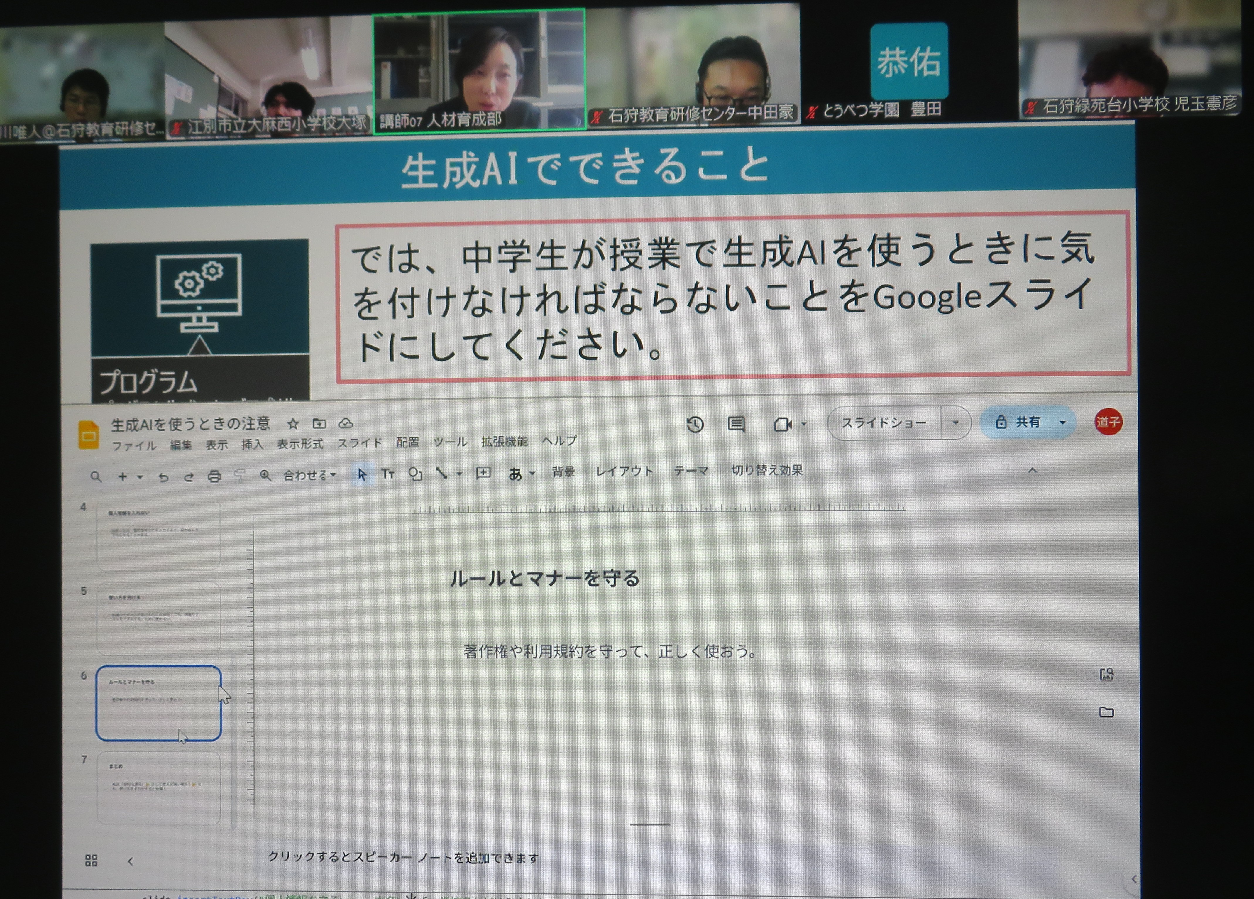 ○生成AIはとても便利なものであると改めて実感したのと同時にどのように活用していけば児童生徒の育成につながるのかを考えなければいけないと思いました。また、情報を精査していく能力も必要ということですので、日頃から情報活用能力について意識して育成していきたいと思います。ありがとうございました。 ○生成AIを利活用していく意識がより高まりました。できることからどんどんAIにやってもらい、教育の効果や質を高めていこうと思いました。 ○日々の業務を生成AIにも助けてもらいながら行って、心身共に健康に仕事をしたいと感じました。今後はまずたたき台として生成AIを最初に頼ってみたいと思います。 ○生成AIについては、プロンプトの入力も十分できていない程使う機会は少なく、小学生にも伝わりやすい内容で調べる程度に利用していました。今回、その他幅広く使えることやそれぞれの特徴を知ることができ、スライド作成は授業の準備に使えたら便利だと感じました。先生からお話いただいた情報の正しい使い方を意識し、学校では人格的な触れ合いを大事に、使うことが目的にならないよう情報を収集しながら試していきたいと思います。 |